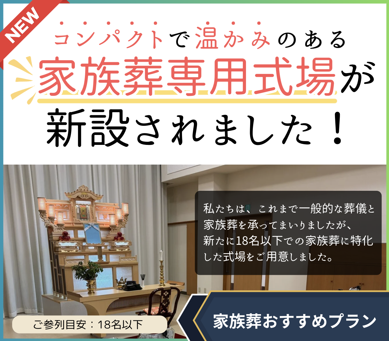 また、18名以上30名以下のご家族葬の場合でも、一般的な葬儀を行う広々とした式場で、ゆったりとした空間でお別れのひと時をお過ごしいただけます。ご希望やご事情に合わせて最適な式場をご提案いたします。